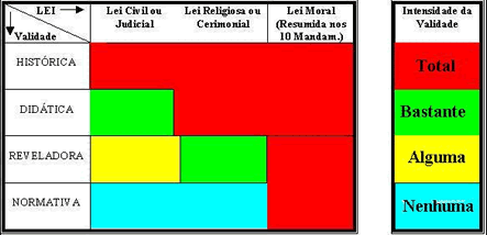 2. A Lei Religiosa: Tinha a finalidade de impressionar aos homens a santidade de Deus e concentrar suas atenções no Messias prometido, Cristo, fora do qual não há esperança. Como tal, foi cumprida com Sua vinda e não se aplica aos nossos dias. Mais uma vez, como exemplo, de falta de compreensão desse aspecto da lei, temos os Adventistas, que erram em querer aplicar parte dela nos dias de hoje (como por exemplo as determinações dietéticas) e em mistura-la com a Lei Civil.
